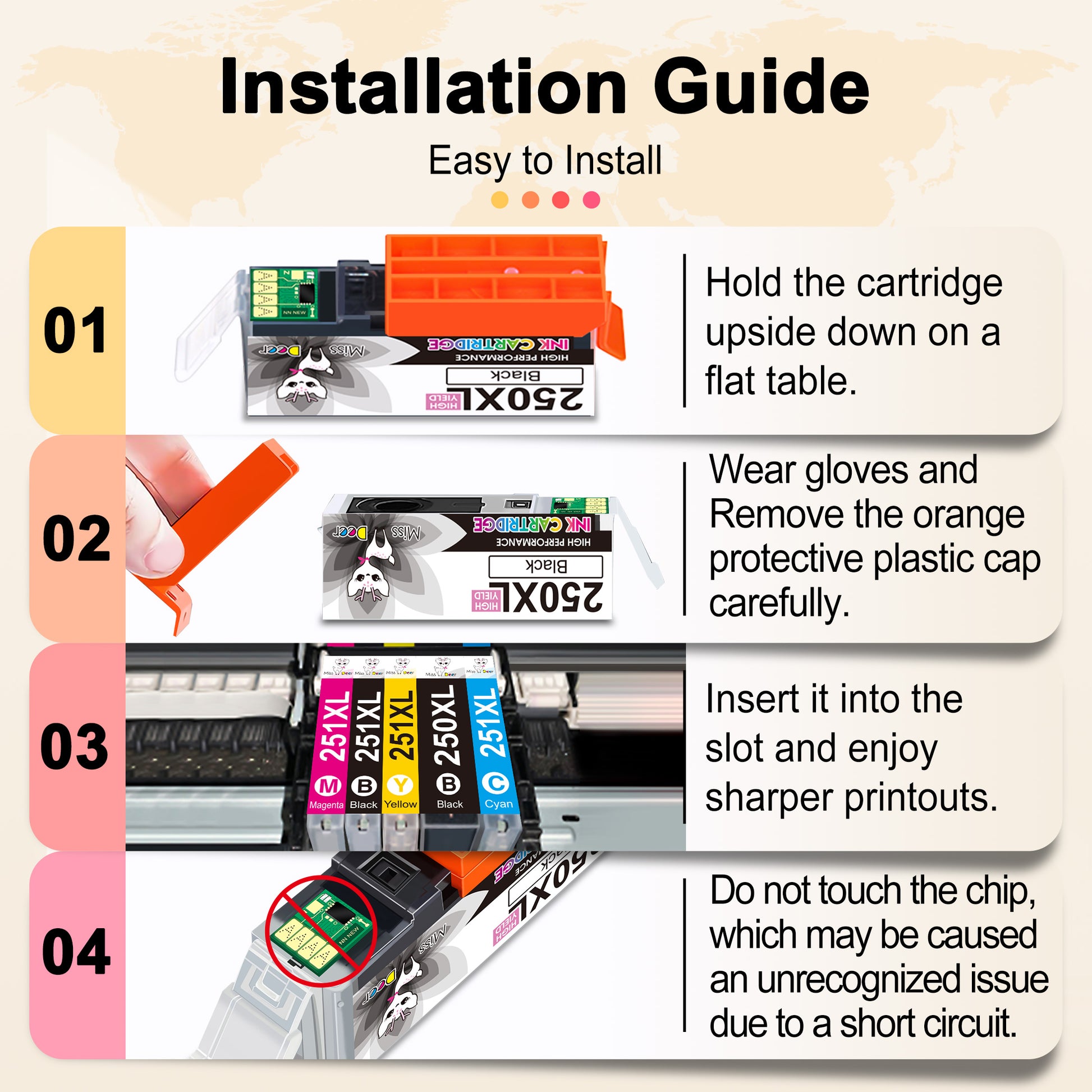 - ★Sunperior Reliability: Miss Deer 250XL and 251XL Ink Cartridges are manufactured in a professional facility with ISO9001, ISO14001, RoHS, REACH, and STMC certified. All 250xl 251xl ink cartridges are strictly inspected before leaving the factory.
